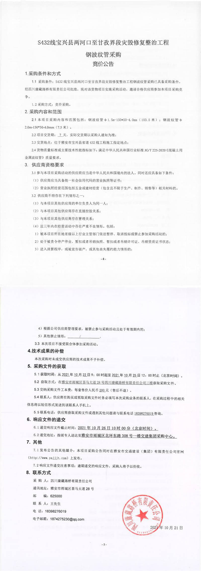 四川康藏路橋有限責(zé)任公司S432線寶興縣兩河口至甘孜界段災(zāi)毀修復(fù)整治工程鋼波紋管采購(gòu)競(jìng)價(jià)公告