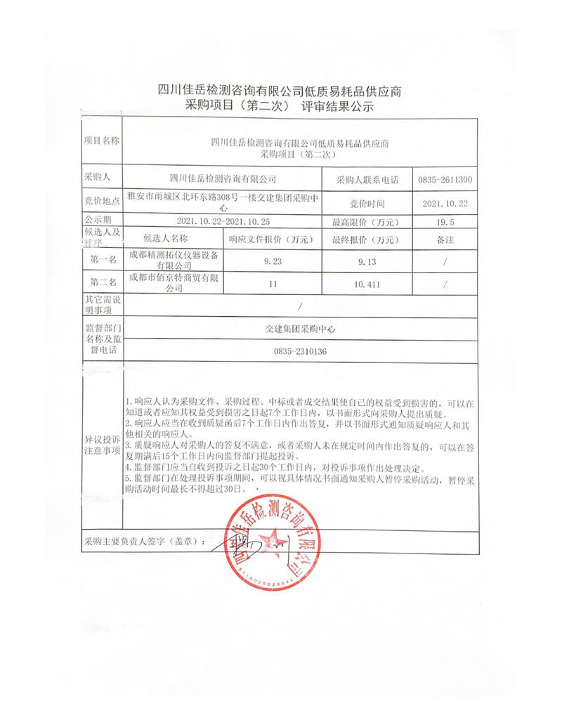 四川佳岳檢測咨詢有限公司低質(zhì)易耗品供應(yīng)商采購項(xiàng)目(第二次)評審結(jié)果公示