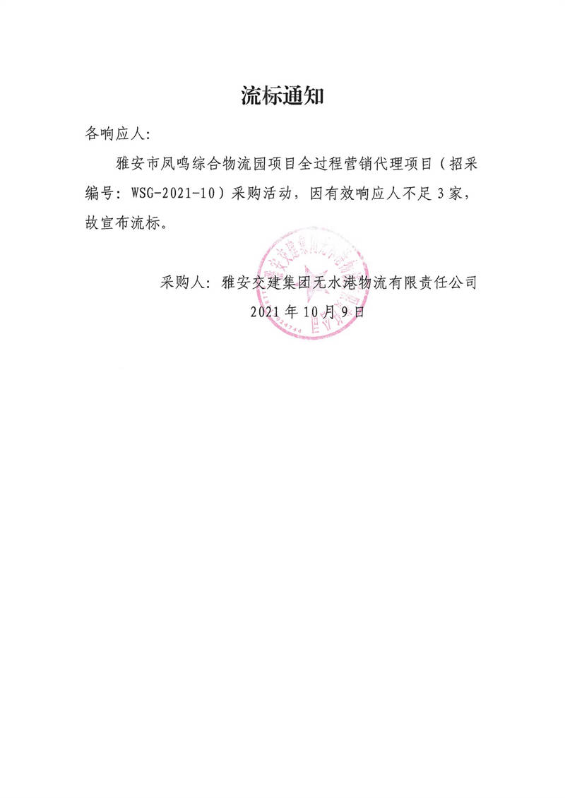 雅安交建集團(tuán)無水港物流有限責(zé)任公司雅安市鳳鳴綜合物流園項目全過程營銷代理項目流標(biāo)通知