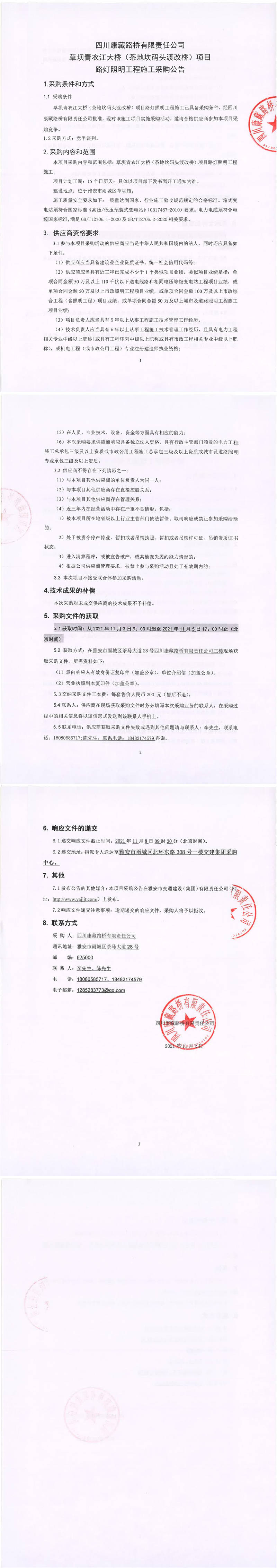 四川康藏路橋有限責任公司草壩青衣江大橋(茶地坎碼頭渡改橋)項目路燈照明工程施工采購公告