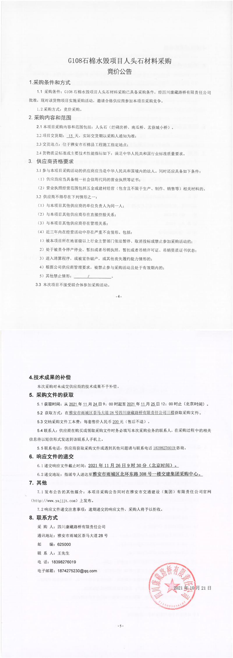 四川康藏路橋有限責(zé)任公司G108石棉水毀項(xiàng)目人頭石材料采購競價(jià)公告