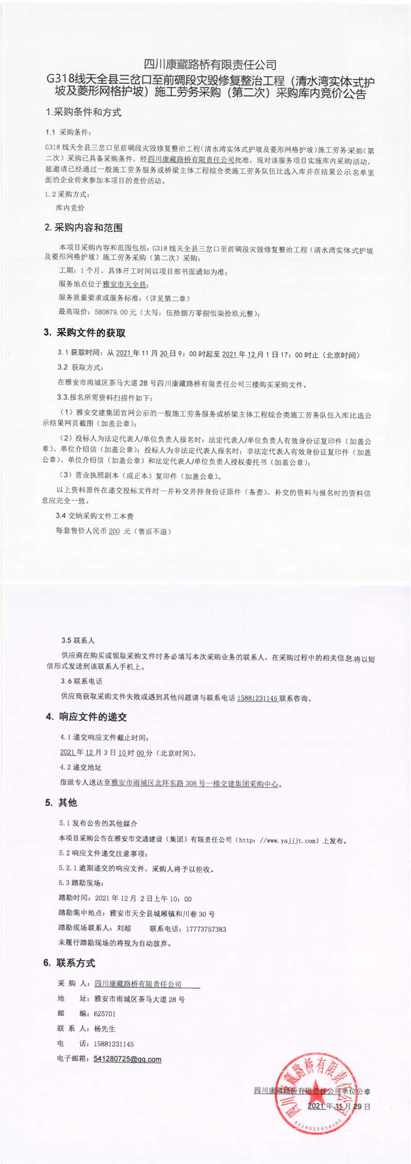 四川康藏路橋有限責(zé)任公司G318線天全縣三岔口至前碉段災(zāi)毀修復(fù)整治工程(清水灣實(shí)體式護(hù)坡及菱形網(wǎng)護(hù)坡)施工勞務(wù)采購(第二次)采購庫內(nèi)競價(jià)公告