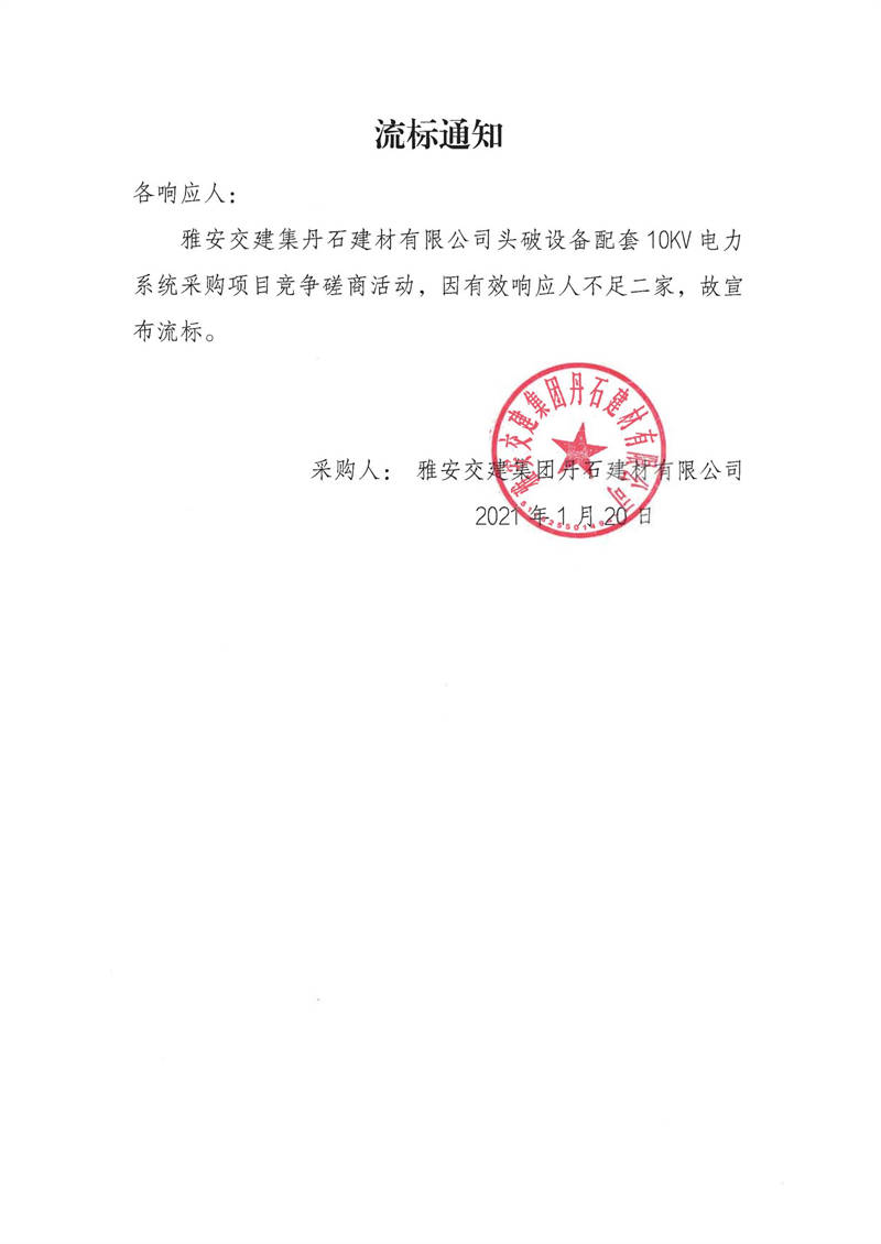 雅安交建集團(tuán)丹石建材有限公司頭破設(shè)備配套10KV電力系統(tǒng)采購(gòu)項(xiàng)目流標(biāo)通知