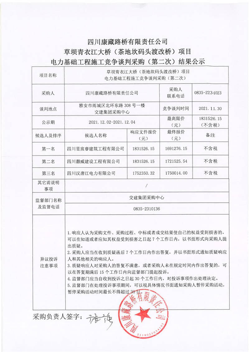 四川康藏路橋有限責任公司草壩青衣江大橋(茶地坎碼頭渡改橋)項目電力基礎工程施工競爭談判采購(第二次)結(jié)果公示