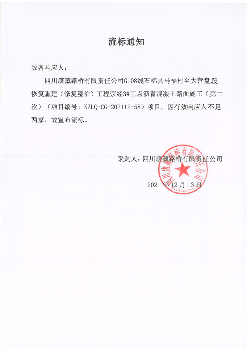 四川康藏路橋有限責(zé)任公司G108線石棉縣馬福村至大營盤段恢復(fù)重建(修復(fù)整治)工程滎經(jīng)3#工點(diǎn)瀝青混凝土路面施工(第二次)流標(biāo)通知
