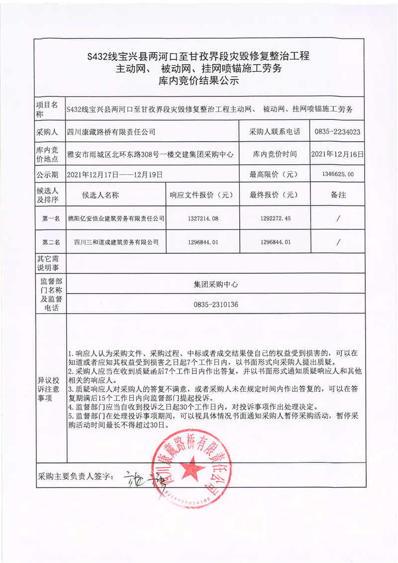 四川康藏路橋有限責(zé)任公司S432線寶興縣兩河口至甘孜界段災(zāi)毀修復(fù)整治工程主動網(wǎng)、補(bǔ)動網(wǎng)、掛網(wǎng)噴錨施工勞務(wù)庫內(nèi)競價結(jié)果公示