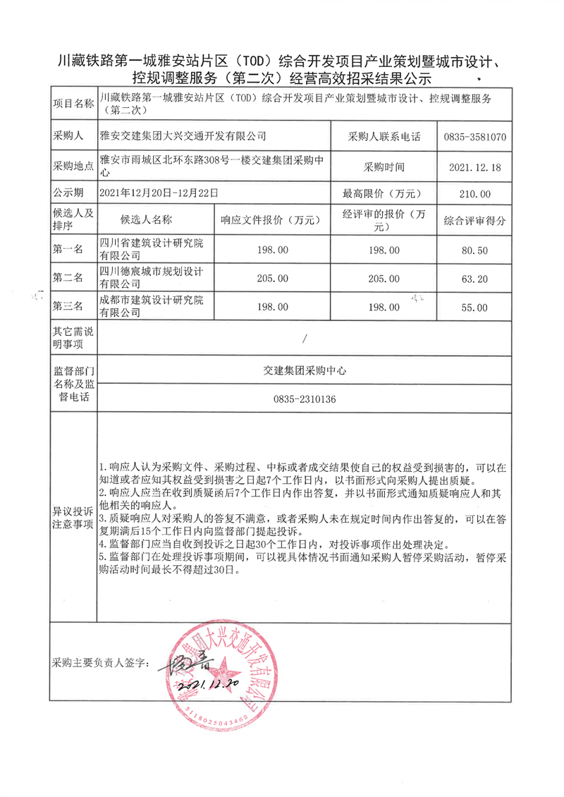 雅安交建集團(tuán)大興交通開(kāi)發(fā)有限公司川藏鐵路第一城雅安站片區(qū)(TOD)綜合開(kāi)發(fā)項(xiàng)目產(chǎn)業(yè)策劃暨城市設(shè)計(jì)、控規(guī)調(diào)整服務(wù)(第二次)經(jīng)營(yíng)高效招采結(jié)果公示