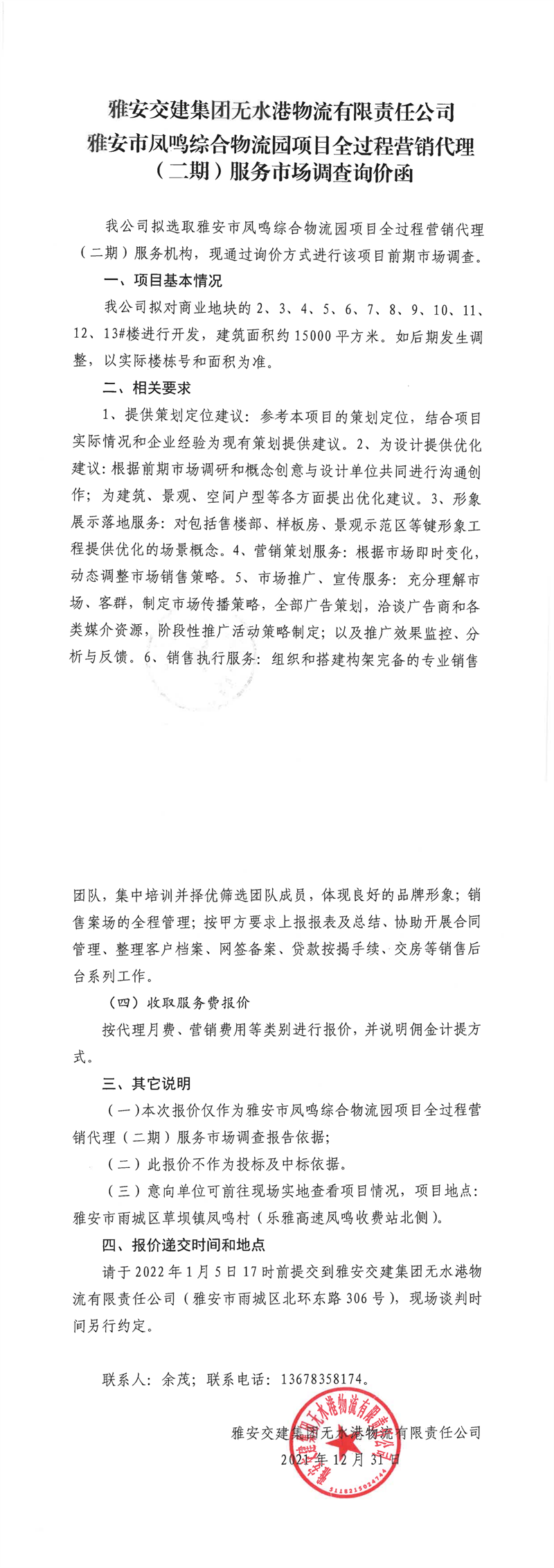 雅安交建集團(tuán)無水港物流有限責(zé)任公司雅安市鳳鳴綜合物流園項(xiàng)目全過程營銷代理(二期)服務(wù)市場(chǎng)調(diào)查詢價(jià)函