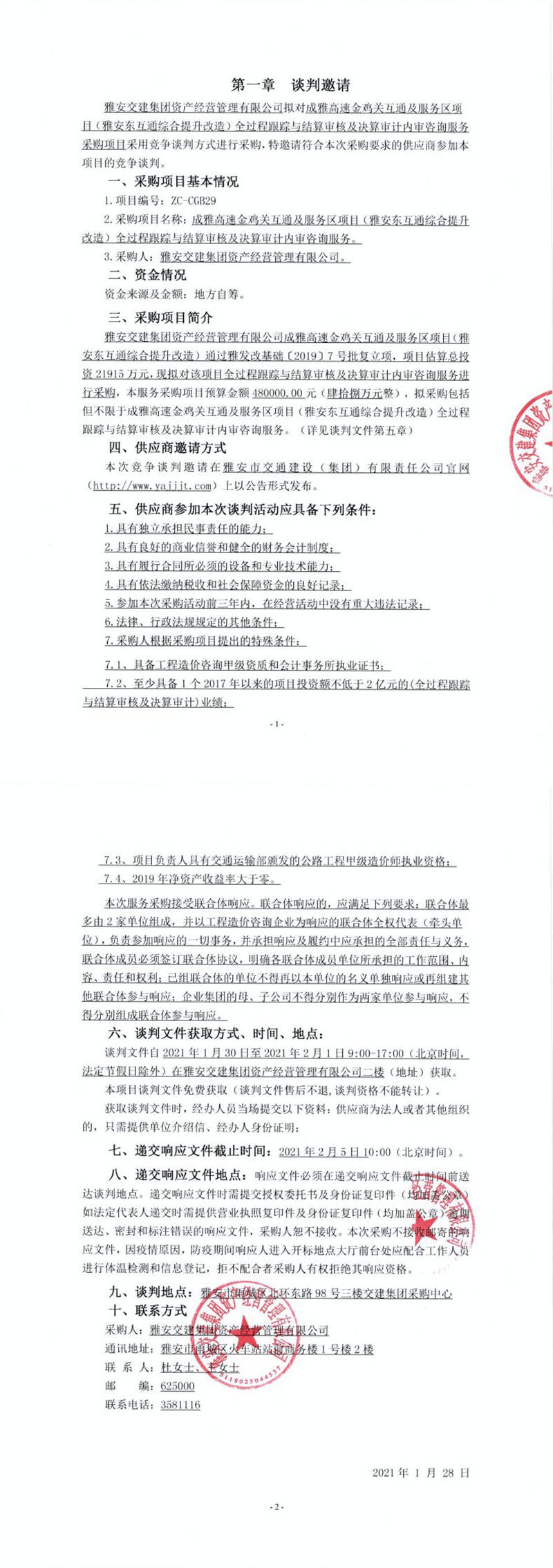 雅安交建集團(tuán)資產(chǎn)經(jīng)營(yíng)管理有限公司成雅高速金雞關(guān)互通及服務(wù)區(qū)項(xiàng)目(雅安東互通綜合提升改造)全過程跟蹤與結(jié)算審核及決算審計(jì)內(nèi)審咨詢服務(wù)談判公告