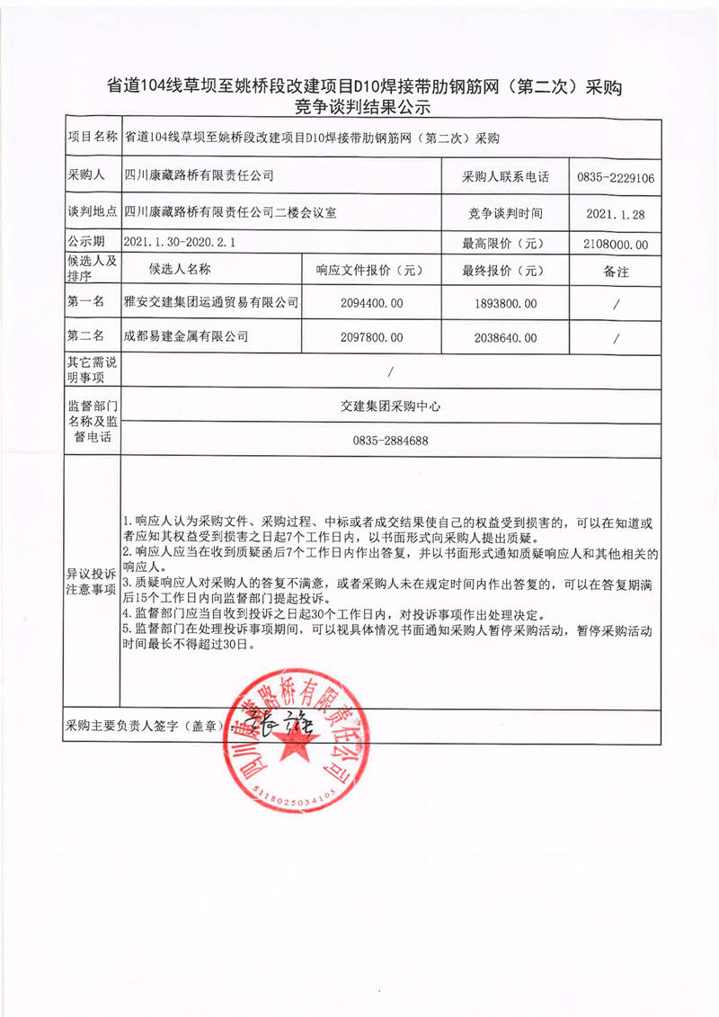 四川康藏路橋有限責(zé)任公司省道104線草壩至姚橋段改建項(xiàng)目D10焊接帶肋鋼筋網(wǎng)(第二次)采購競爭談判結(jié)果公示