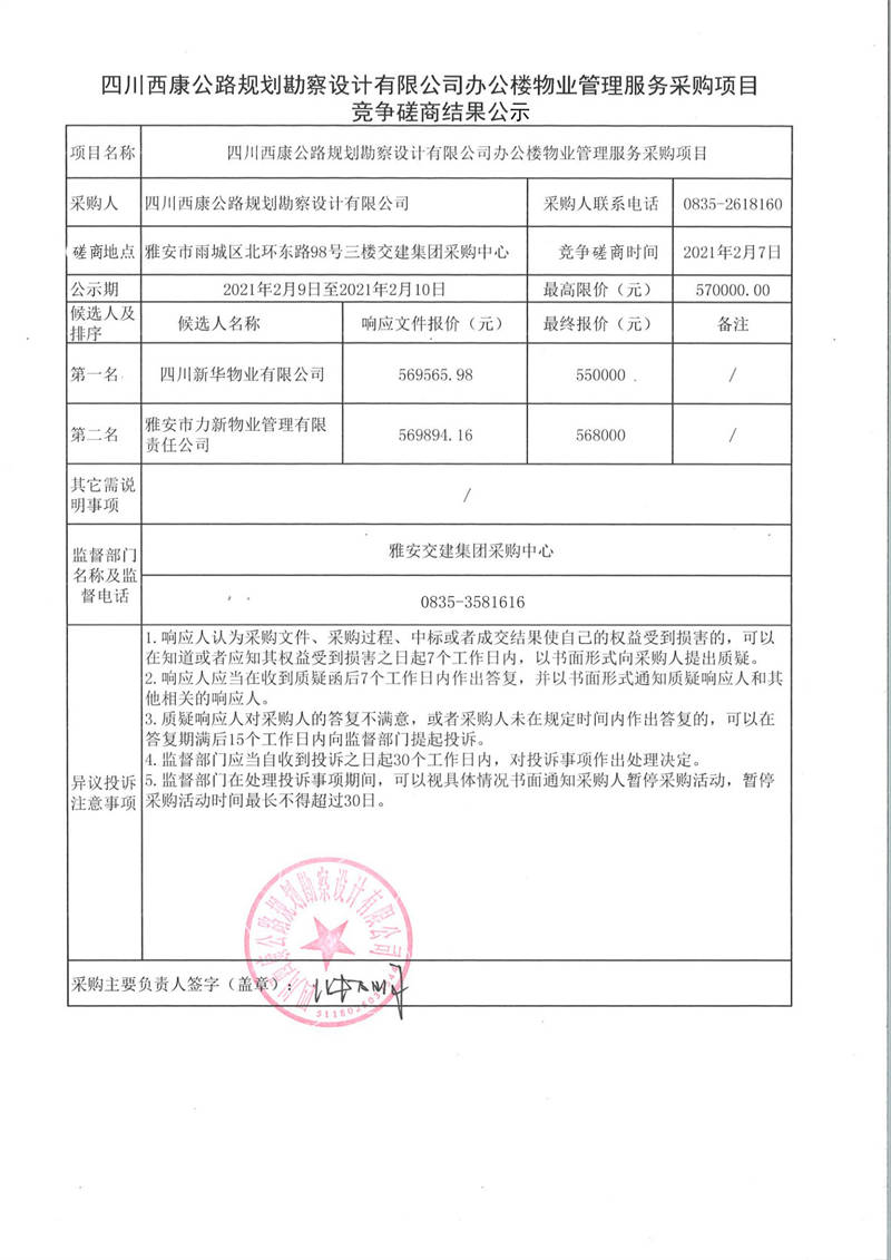 四川西康公路規(guī)劃勘察設(shè)計(jì)有限公司辦公樓物業(yè)管理服務(wù)采購項(xiàng)目競(jìng)爭(zhēng)磋商結(jié)果公示