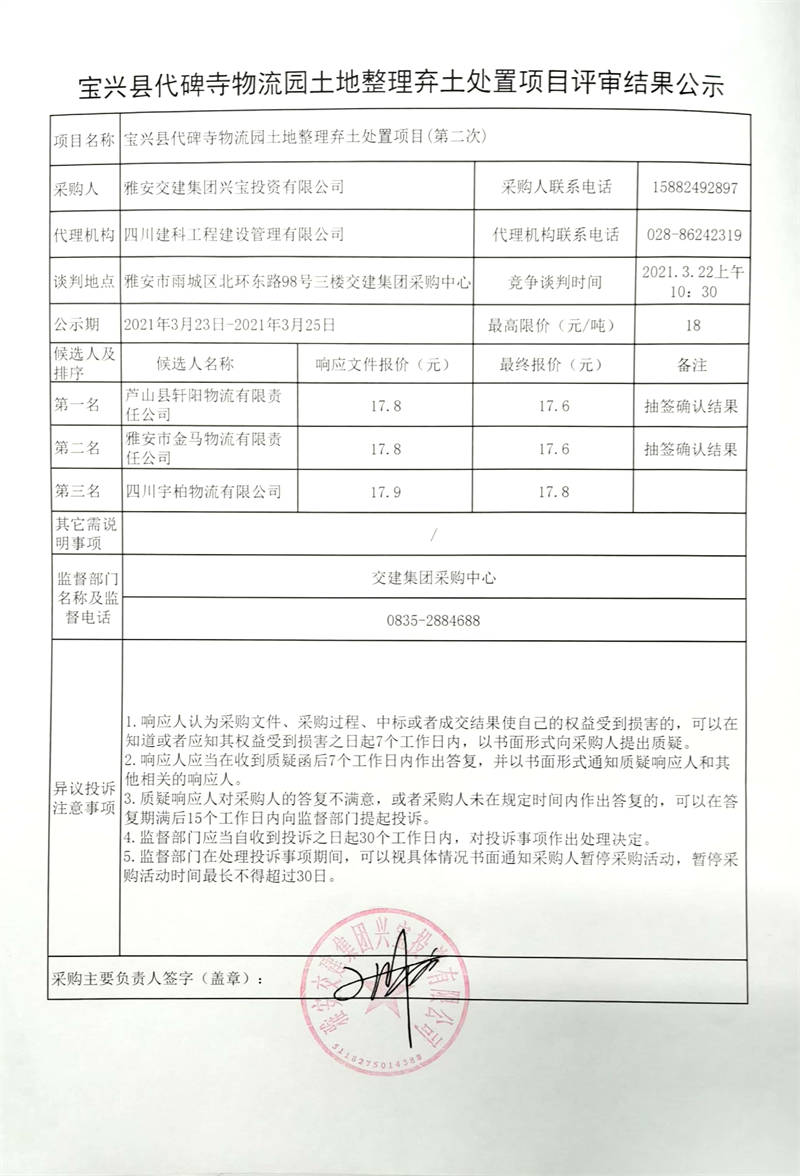 雅安交建集團興寶投資有限公司寶興縣代碑寺物流園土地整理棄土處置項目評審結(jié)果公示