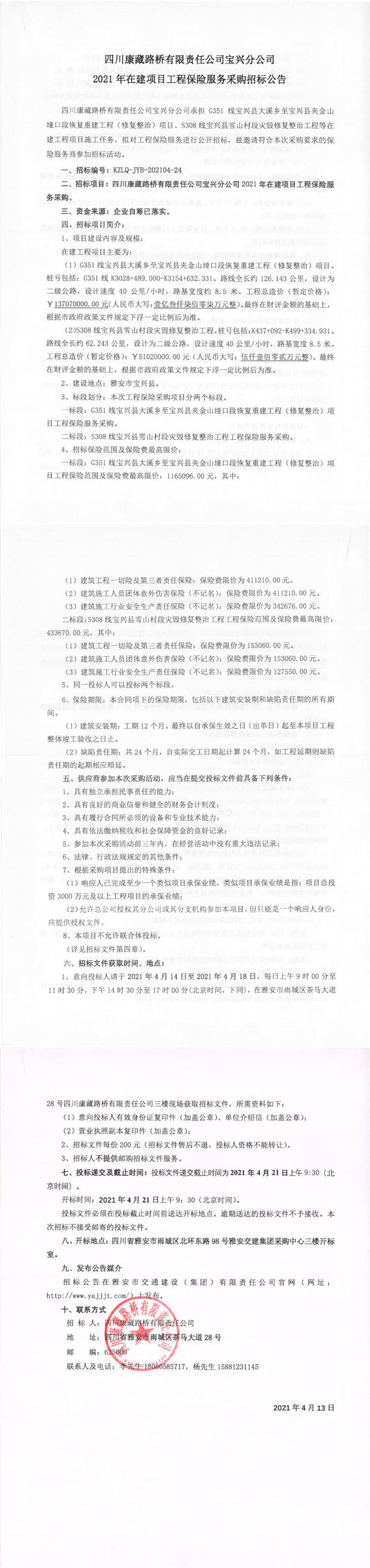 四川康藏路橋有限責任公司寶興分公司2021年在建項目工程保險服務(wù)采購招標公告