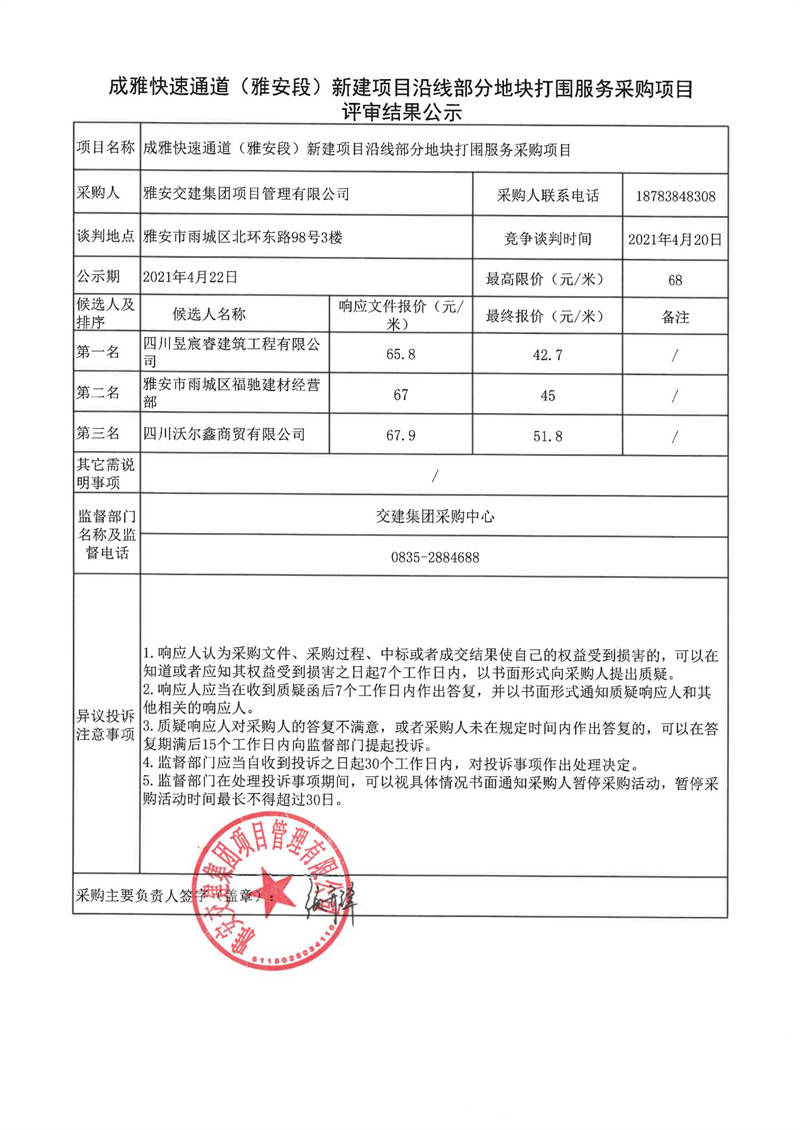 雅安交建集團(tuán)項(xiàng)目管理有限公司成雅快速通道(雅安段)新建項(xiàng)目沿線部分地塊打圍服務(wù)采購項(xiàng)目評審結(jié)果公示