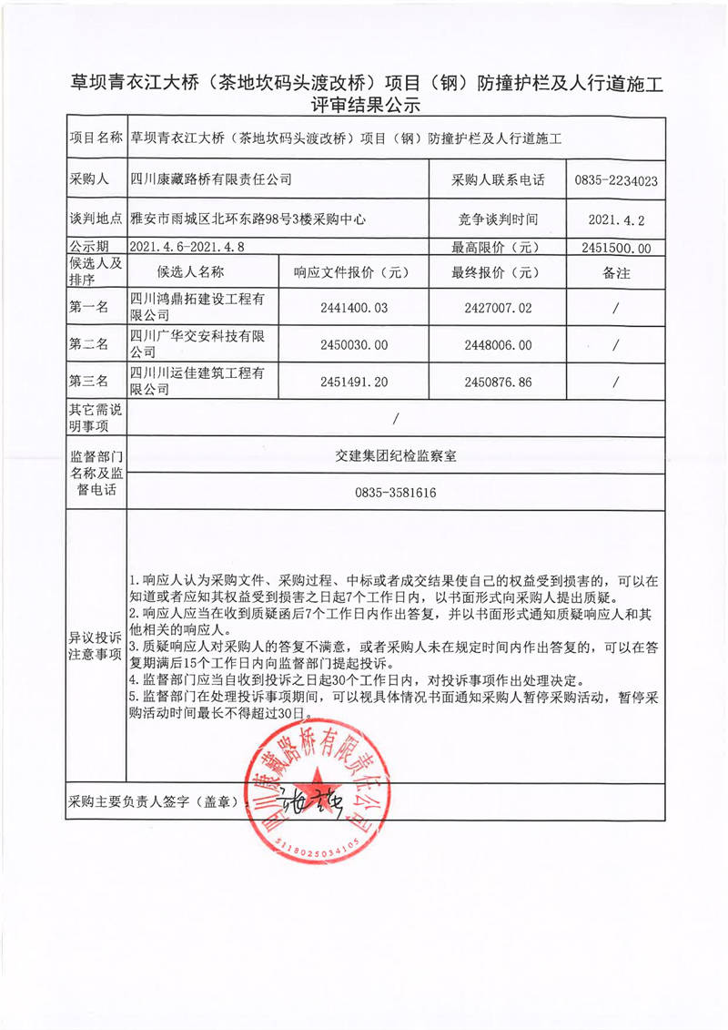 四川康藏路橋有限責任公司草壩青衣江大橋(茶地坎碼頭渡改橋)項目(鋼)防撞護欄及人行道施工評審結(jié)果公示