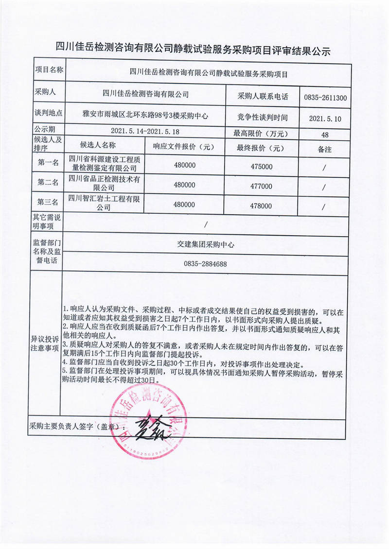 四川佳岳檢測(cè)咨詢(xún)有限公司靜載試驗(yàn)服務(wù)采購(gòu)項(xiàng)目評(píng)審結(jié)果公示