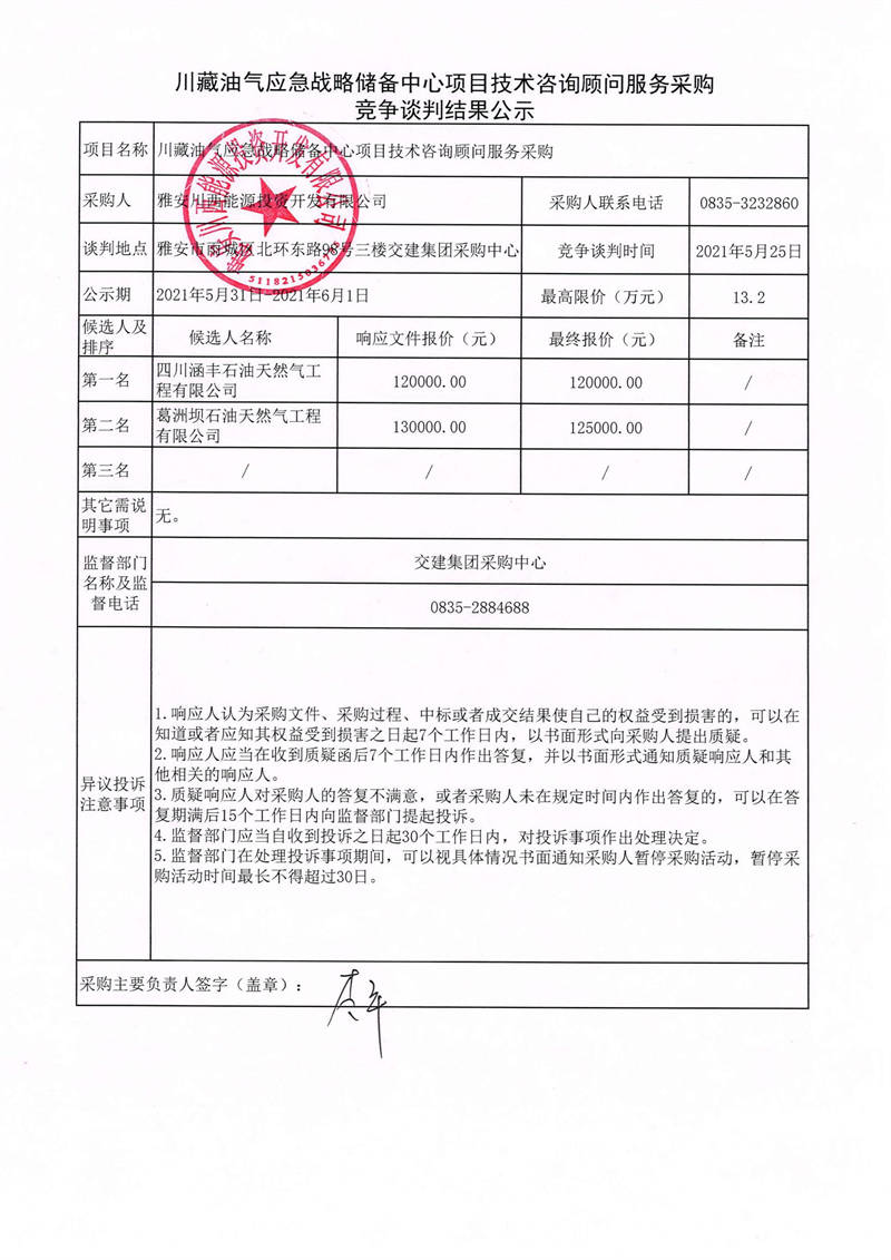 雅安川西能源投資開發(fā)有限公司川藏油氣應急戰(zhàn)略儲備中心項目技術咨詢顧問服務采購競爭談判結果公示