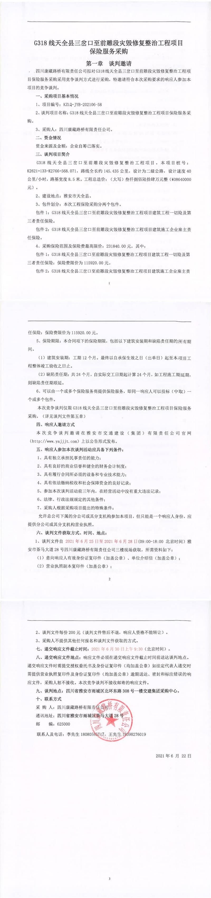 四川康藏路橋有限責(zé)任公司G318線天全縣三岔口至前雕段災(zāi)毀修復(fù)整治工程項(xiàng)目保險(xiǎn)服務(wù)采購競(jìng)爭(zhēng)談判公告