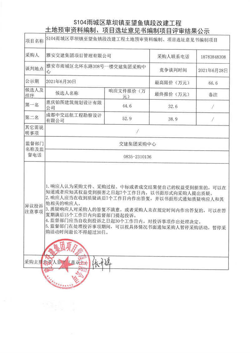 雅安交建集團(tuán)項(xiàng)目管理有限公司S104雨城區(qū)草壩鎮(zhèn)至望魚鎮(zhèn)段改建工程土地預(yù)審資料編制、項(xiàng)目選址意見(jiàn)書編制項(xiàng)目評(píng)審結(jié)果公示