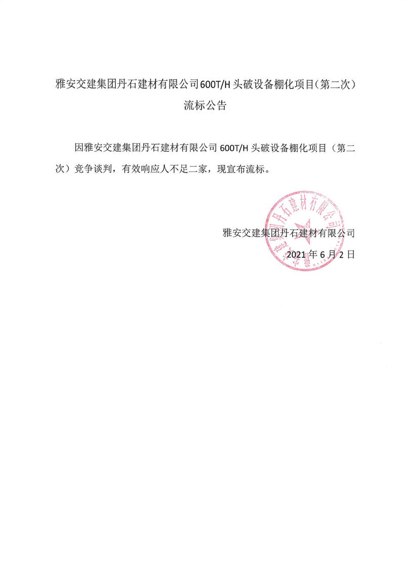 雅安交建集團丹石建材有限公司600T/H頭破設(shè)備棚化項目(第二次)流標(biāo)公告