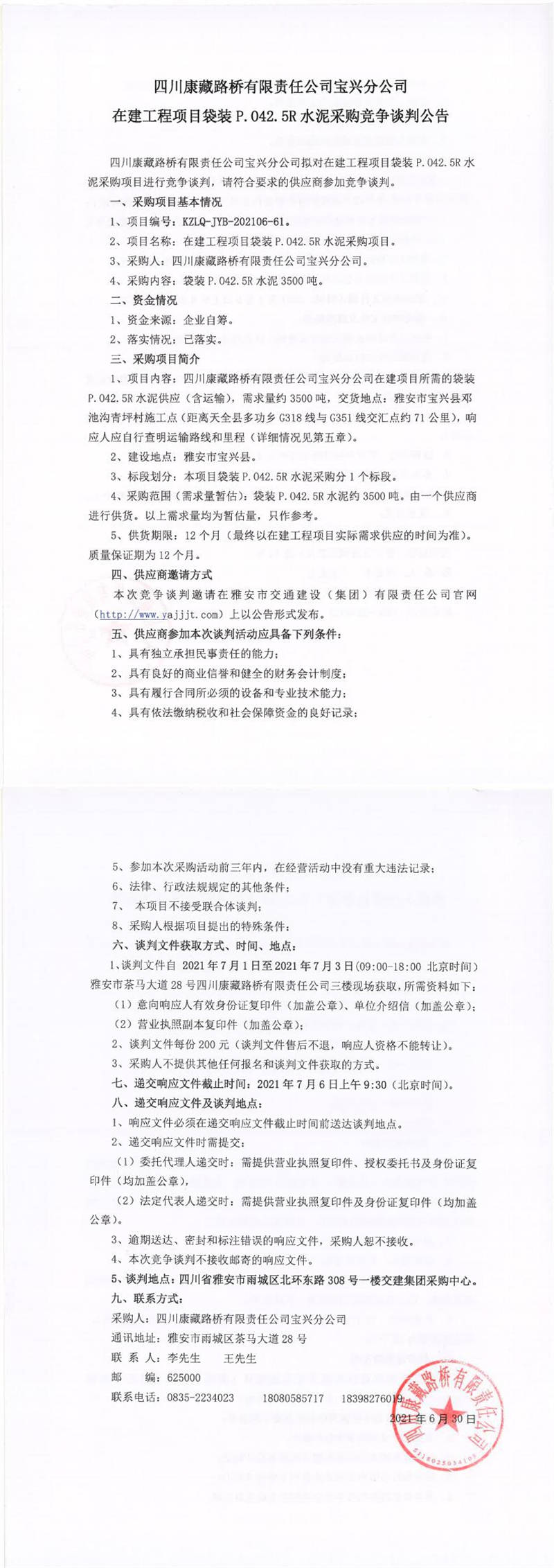 四川康藏路橋有限責任公司寶興分公司在建工程項目袋裝P.042.5R水泥采購競爭談判公告