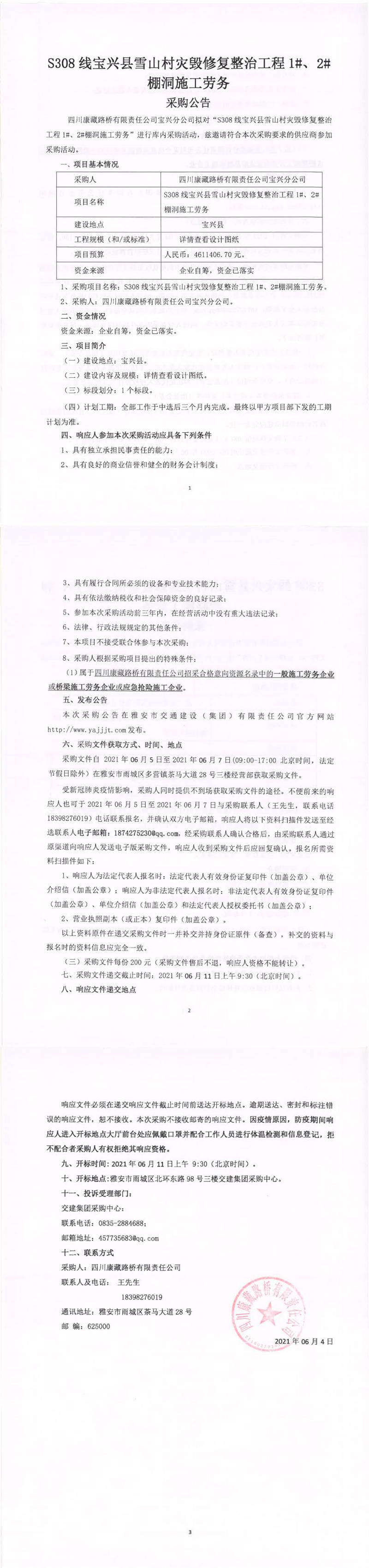 四川康藏路橋有限責(zé)任公司S308線寶興縣雪山村災(zāi)毀修復(fù)整治工程1#、2#棚洞施工勞務(wù)采購公告