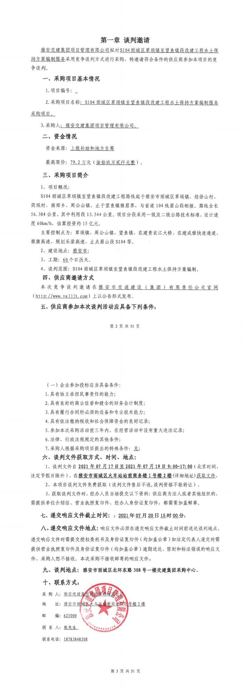 雅安交建集團(tuán)項(xiàng)目管理有限公司S104雨城區(qū)草壩鎮(zhèn)至望魚段改建工程水土保持方案編制服務(wù)采購項(xiàng)目競爭談判公告