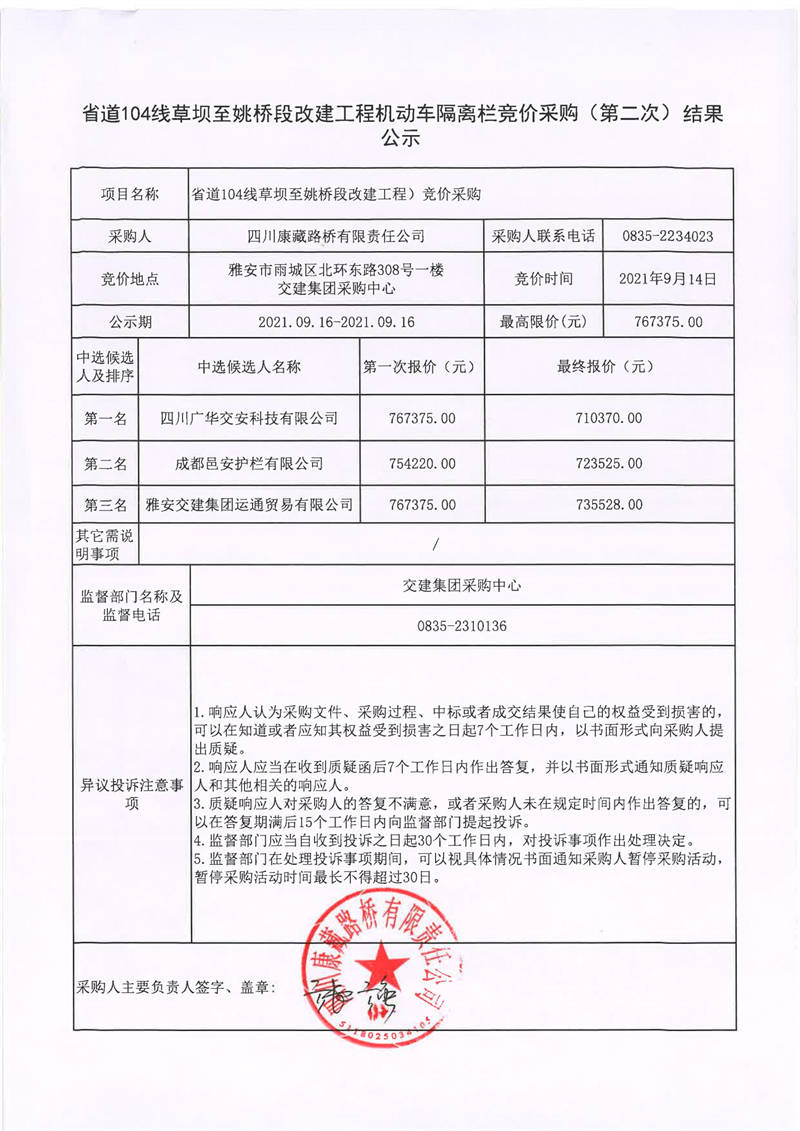 四川康藏路橋有限責(zé)任公司省道104線草壩至姚橋段改建工程機(jī)動車隔離欄競價采購(第二次)結(jié)果公示