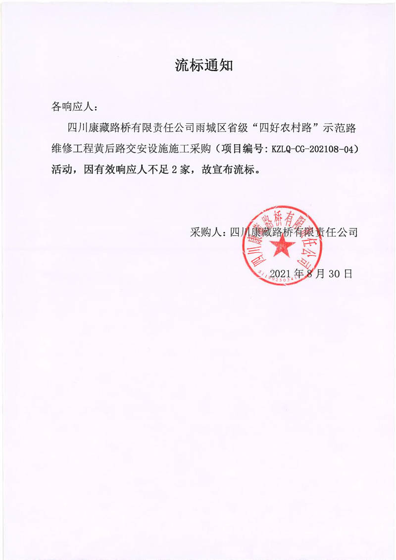 四川康藏路橋有限責(zé)任公司雨城區(qū)省級(jí)“四好農(nóng)村路”示范路維修工程黃后路交安設(shè)施施工采購(gòu)流標(biāo)通知