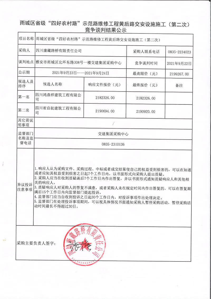 四川康藏路橋有限責任公司雨城區(qū)省級“四好農(nóng)村路”示范路維修工程黃后路交安設施施工(第二次)競爭談判結果公示