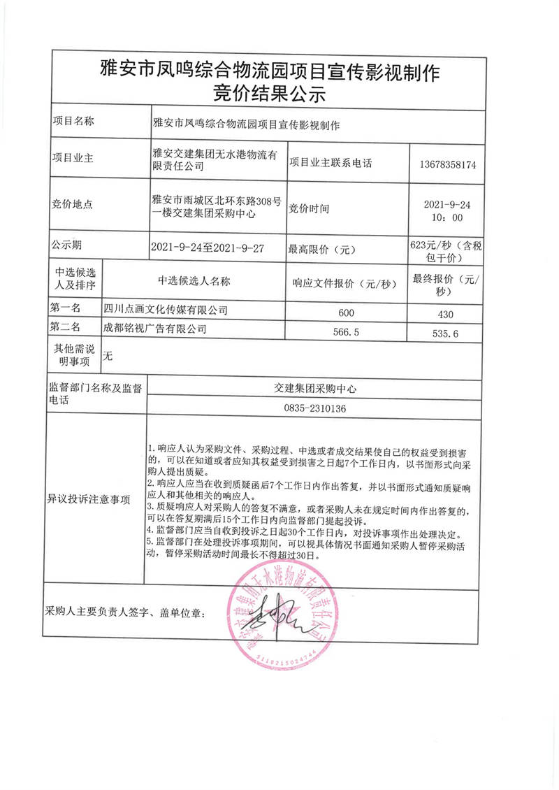 雅安交建集團無水港物流有限責任公司雅安市鳳鳴綜合物流園項目宣傳影視制作競價結果公示