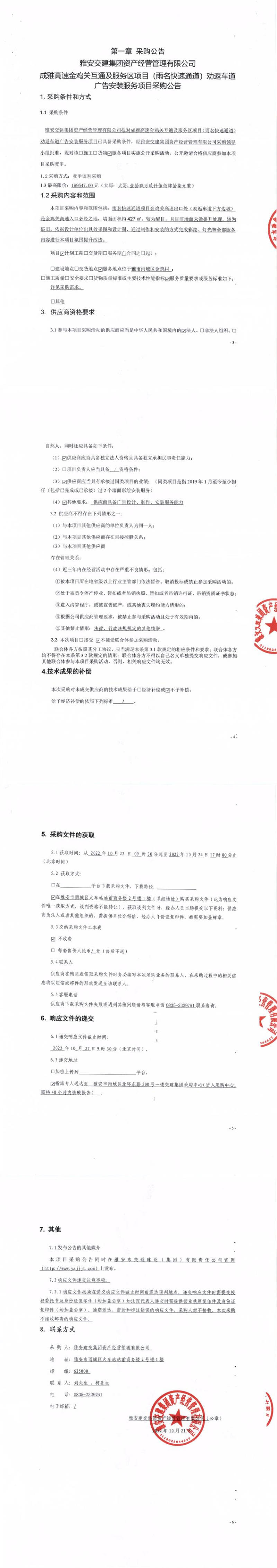 雅安交建集團資產(chǎn)經(jīng)營管理有限公司成雅高速金雞關互通及服務區(qū)項目(雨名快速通道)勸返車道廣告安裝服務項目采購公告