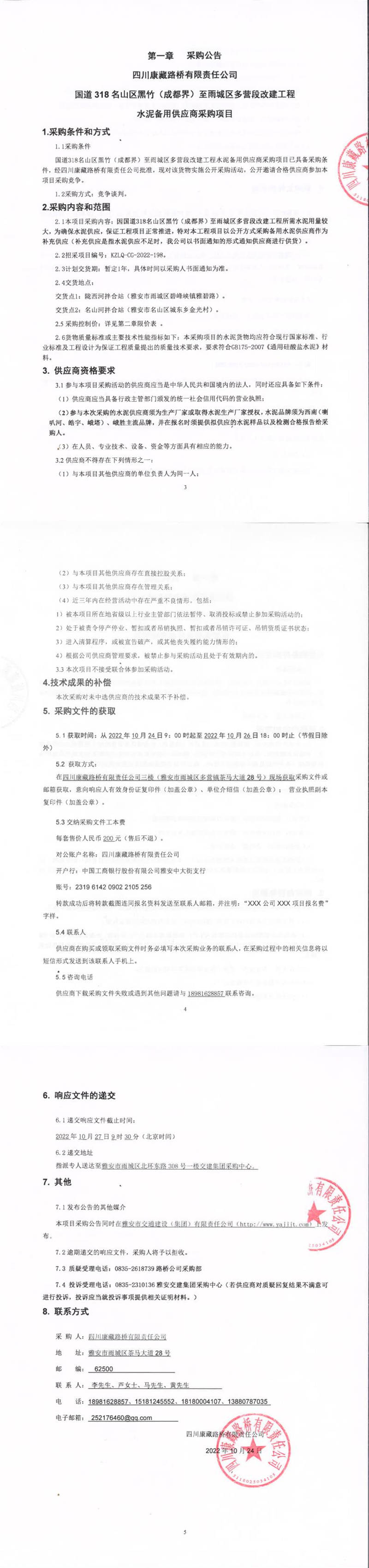 四川康藏路橋有限責(zé)任公司國道318名山區(qū)黑竹(成都界)至雨城區(qū)多營段改建工程水泥備用供應(yīng)商采購項(xiàng)目補(bǔ)遺書(一)
