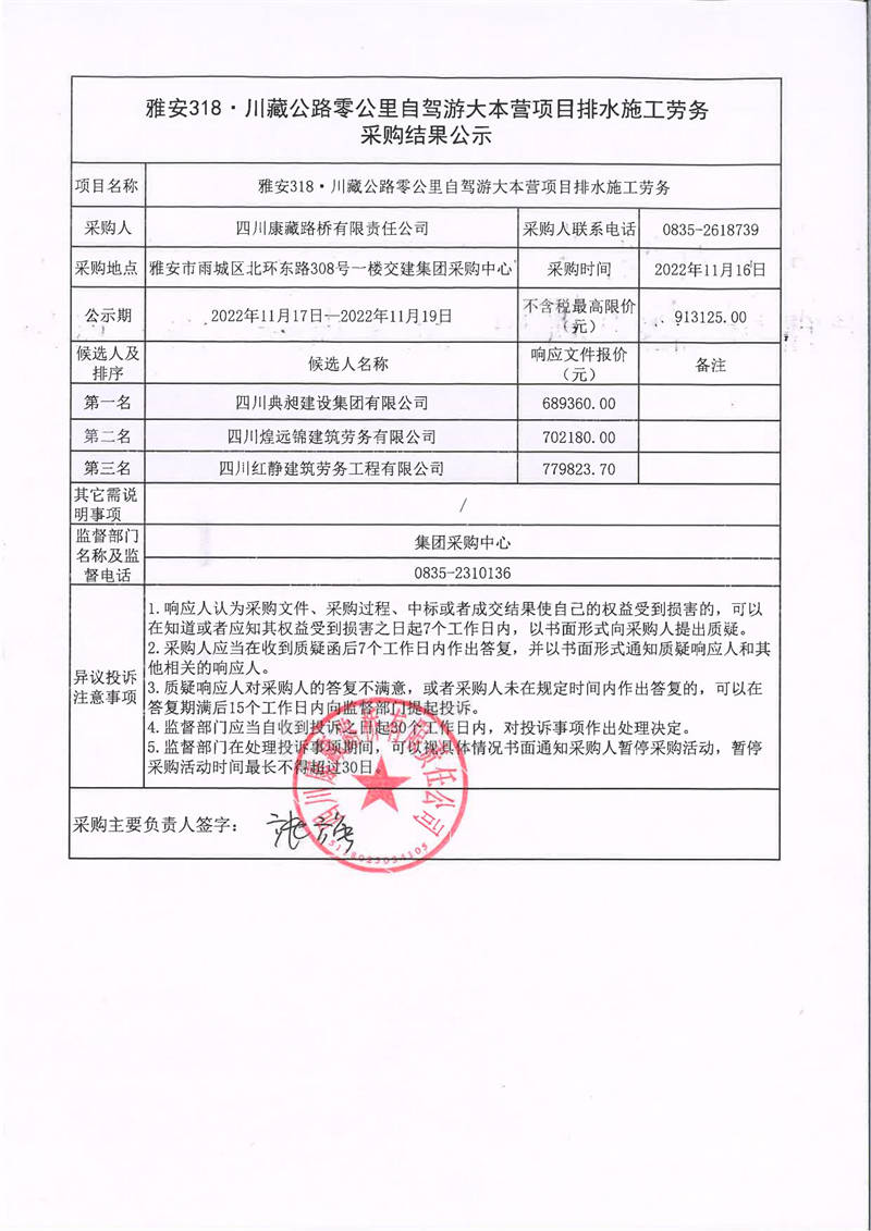四川康藏路橋有限責(zé)任公司雅安318·川藏公路零公里自駕游大本營項(xiàng)目排水施工勞務(wù)采購結(jié)果公示