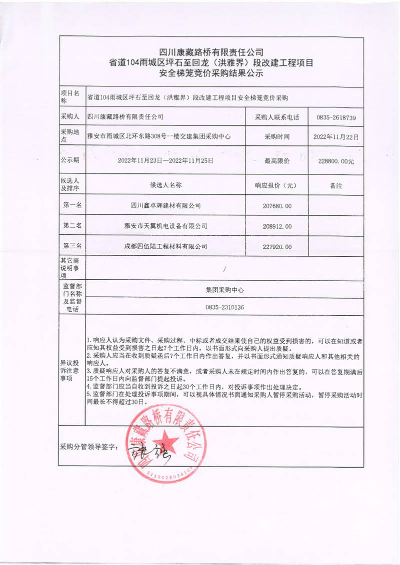 四川康藏路橋有限責(zé)任公司省道104雨城區(qū)坪石至回龍(洪雅界)段改建工程項(xiàng)目安全梯籠競(jìng)價(jià)采購(gòu)結(jié)果公示