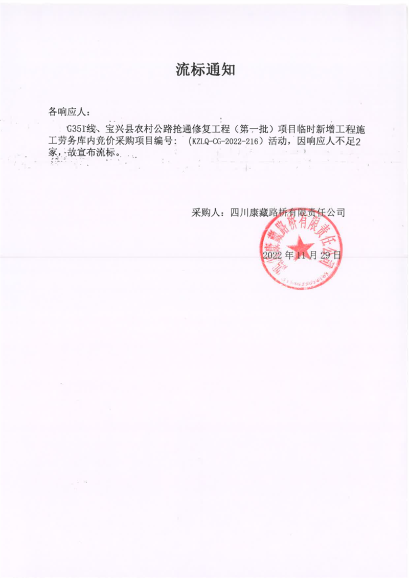 四川康藏路橋有限責(zé)任公司G351線、寶興縣農(nóng)村公路搶通修復(fù)工程(第一批)項(xiàng)目臨時(shí)新增工程施工勞務(wù)庫內(nèi)競(jìng)價(jià)采購流標(biāo)通知