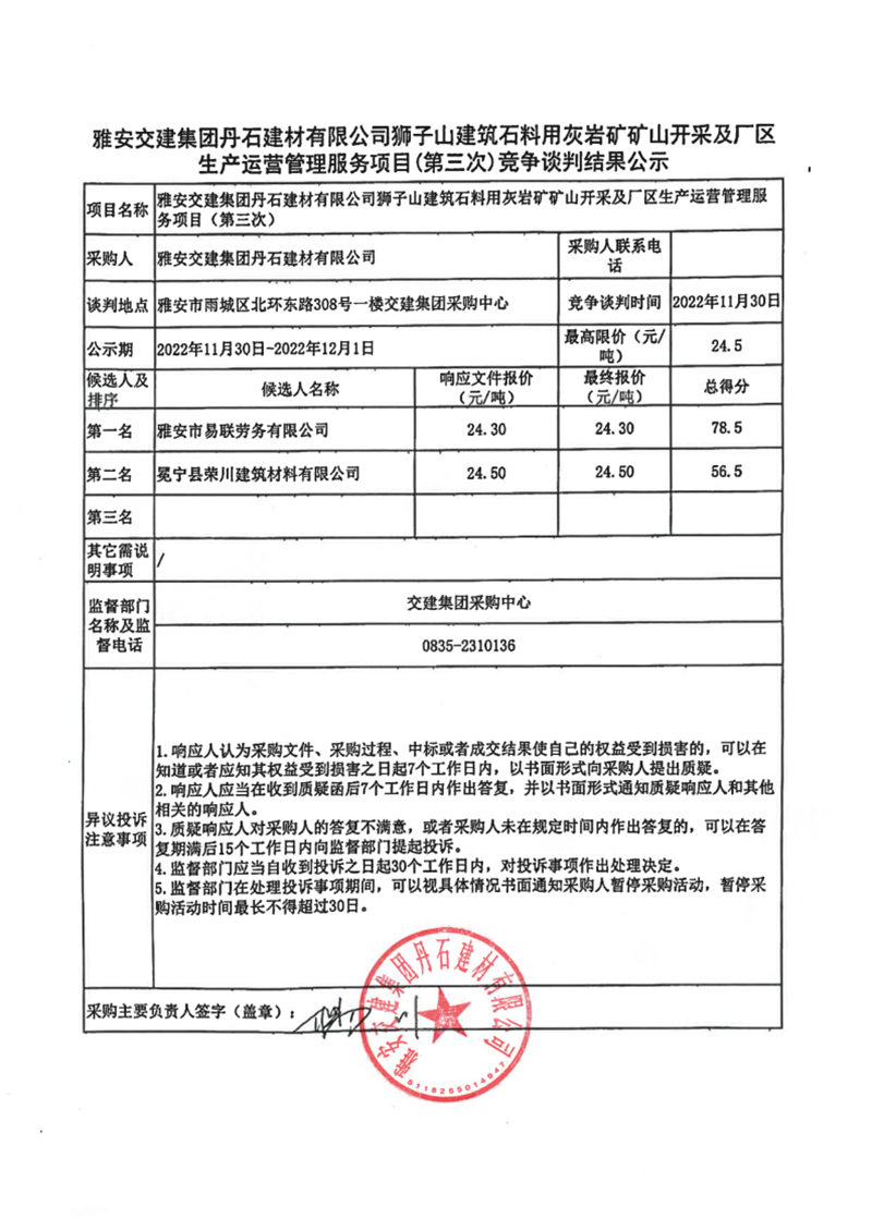 雅安交建集團(tuán)丹石建材有限公司獅子山建筑石料用灰?guī)r礦礦山開采及廠區(qū)生產(chǎn)運(yùn)營(yíng)管理服務(wù)項(xiàng)目(第三次)競(jìng)爭(zhēng)談判結(jié)果公示