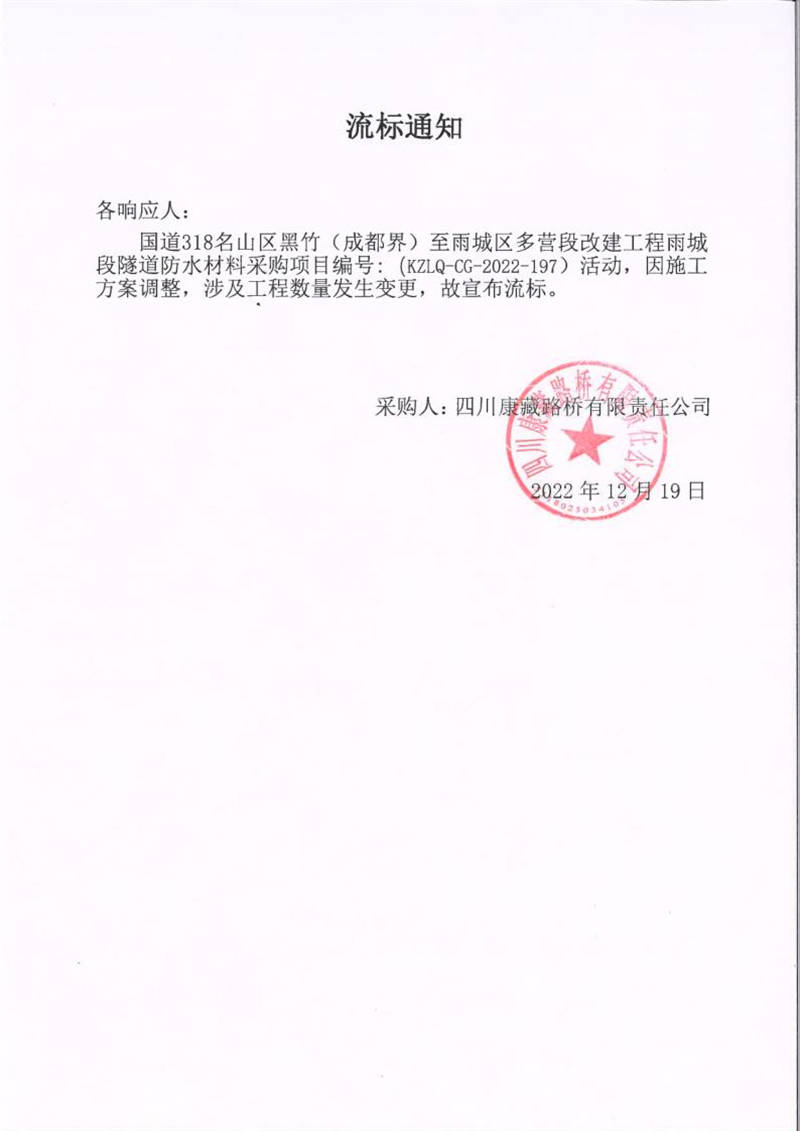 四川康藏路橋有限責(zé)任公司國道318名山區(qū)黑竹(成都界)至雨城區(qū)多營段改建工程雨城段隧道防水材料采購流標(biāo)通知