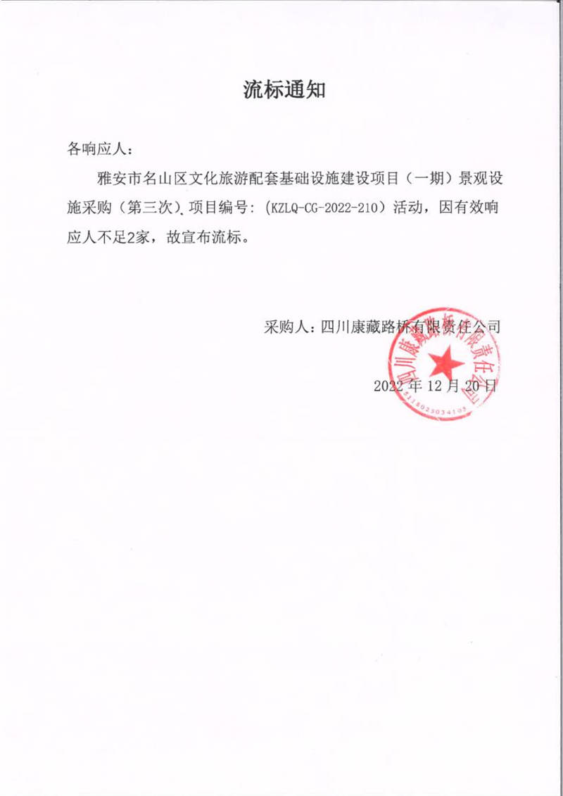 四川康藏路橋有限責(zé)任公司雅安市名山區(qū)文化旅游配套基礎(chǔ)設(shè)施建設(shè)項目(一期)景觀設(shè)施采購(第三次)流標通知