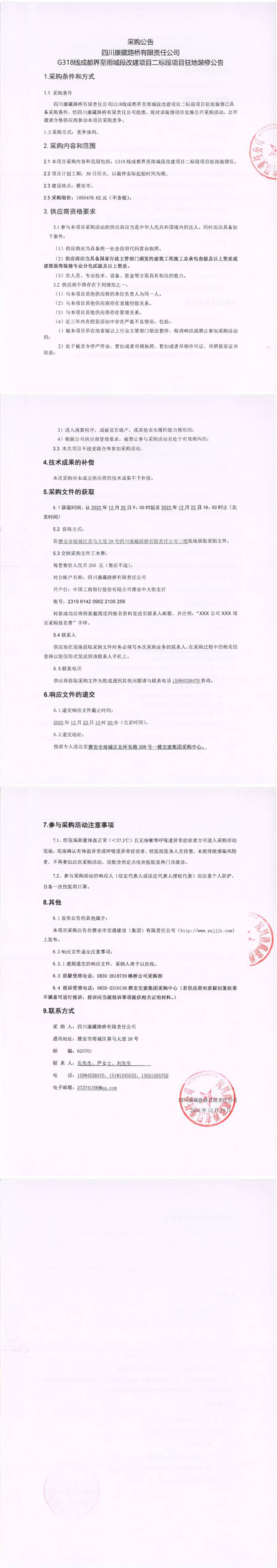 四川康藏路橋有限責(zé)任公司G318線成都界至雨城段改建項(xiàng)目二標(biāo)段項(xiàng)目駐地裝修采購(gòu)公告
