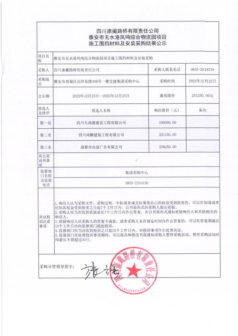 四川康藏路橋有限責(zé)任公司雅安市無(wú)水港鳳鳴綜合物流園項(xiàng)目施工圍擋材料及安裝采購(gòu)結(jié)果公示