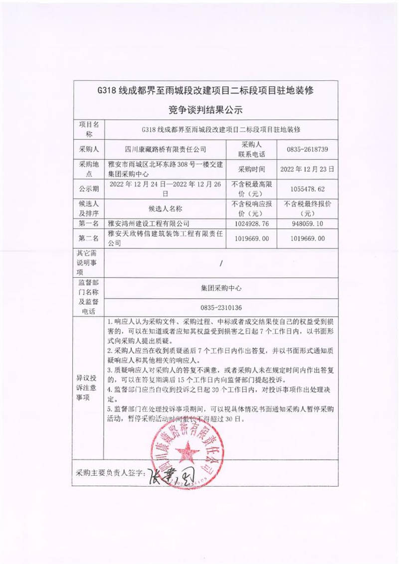 四川康藏路橋有限責(zé)任公司G318線成都界至雨城段改建項目二標段項目駐地裝修競爭談判結(jié)果公示