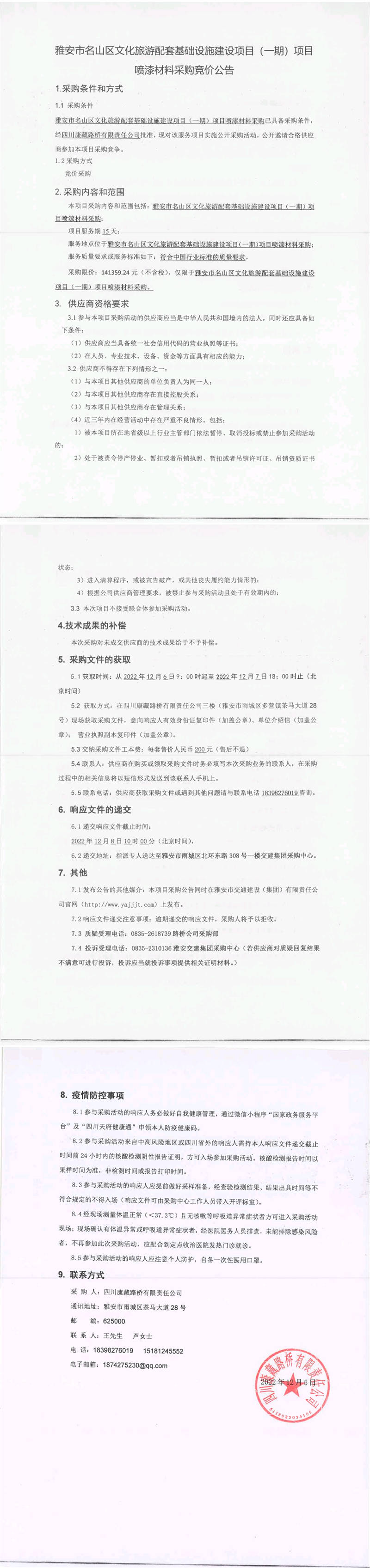 四川康藏路橋有限責(zé)任公司雅安市名山區(qū)文化旅游配套基礎(chǔ)設(shè)施建設(shè)項(xiàng)目(一期)項(xiàng)目噴漆材料采購(gòu)結(jié)果公示