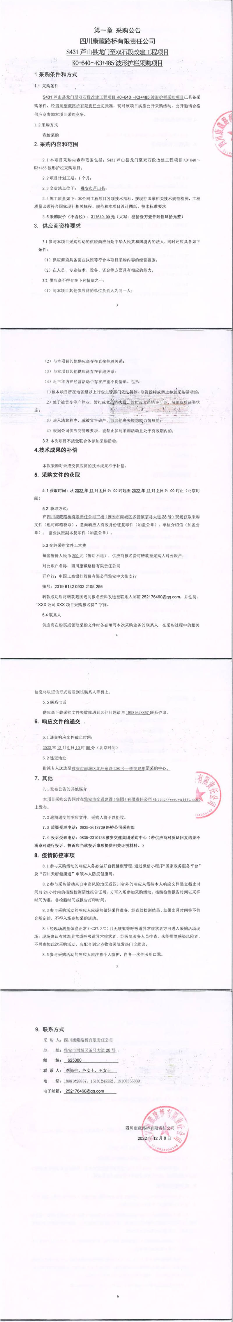 四川康藏路橋有限責(zé)任公司S431蘆山縣龍門鎮(zhèn)至雙石段改建工程項目K0+640-K3+485波形護欄采購項目采購公告