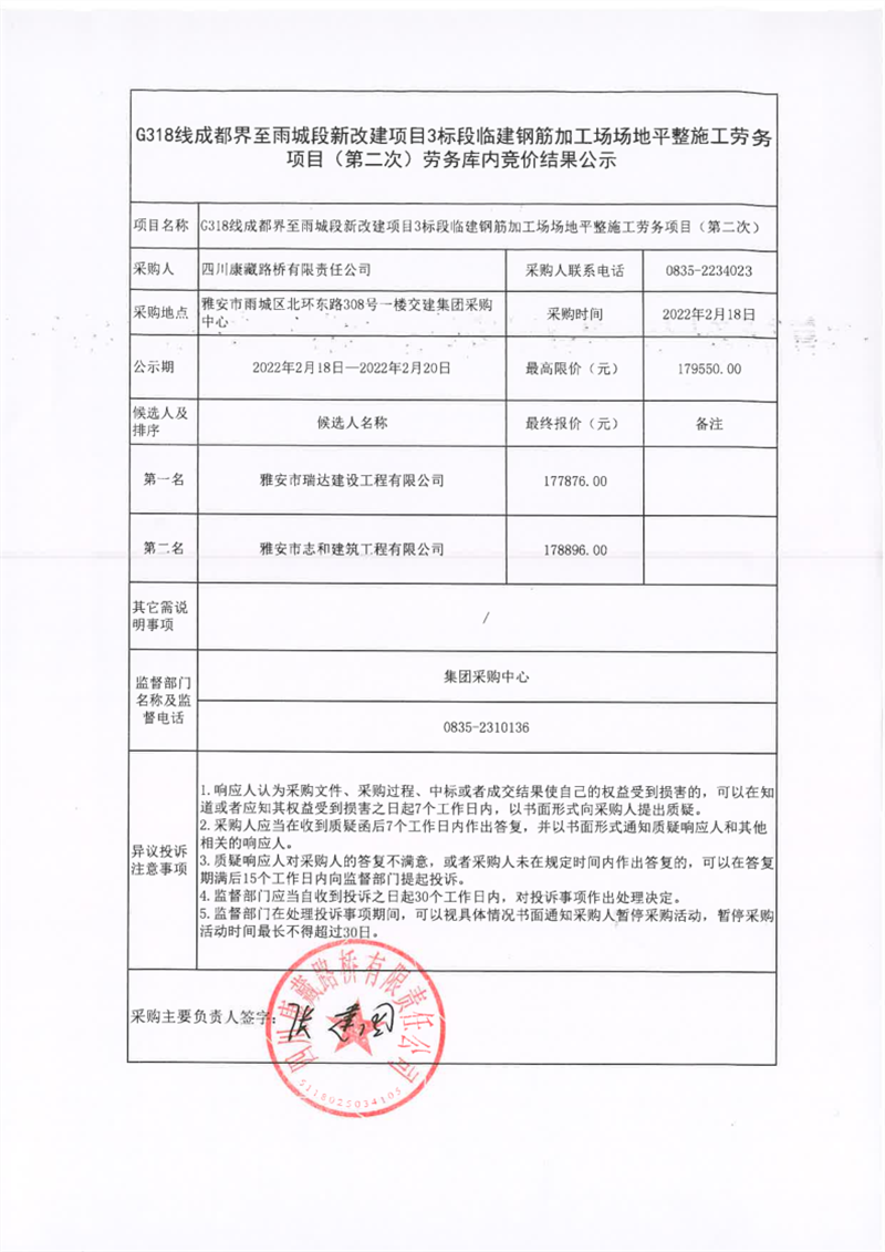 四川康藏路橋有限責(zé)任公司G318線成都界至雨城段新改建項(xiàng)目3標(biāo)段鋼筋加工場(chǎng)場(chǎng)地硬化施工勞務(wù)庫(kù)內(nèi)競(jìng)價(jià)結(jié)果公示
