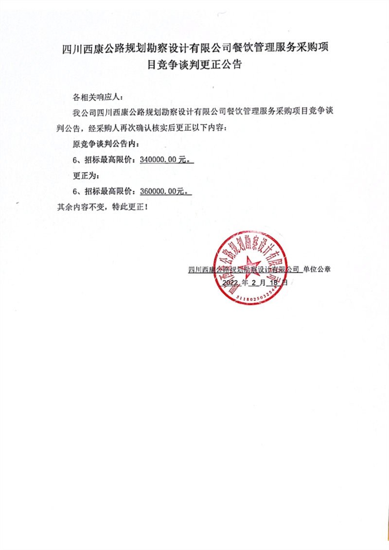 四川西康公路規(guī)劃勘察設計有限公司餐飲管理服務采購項目競爭談判更正公告(第二次)