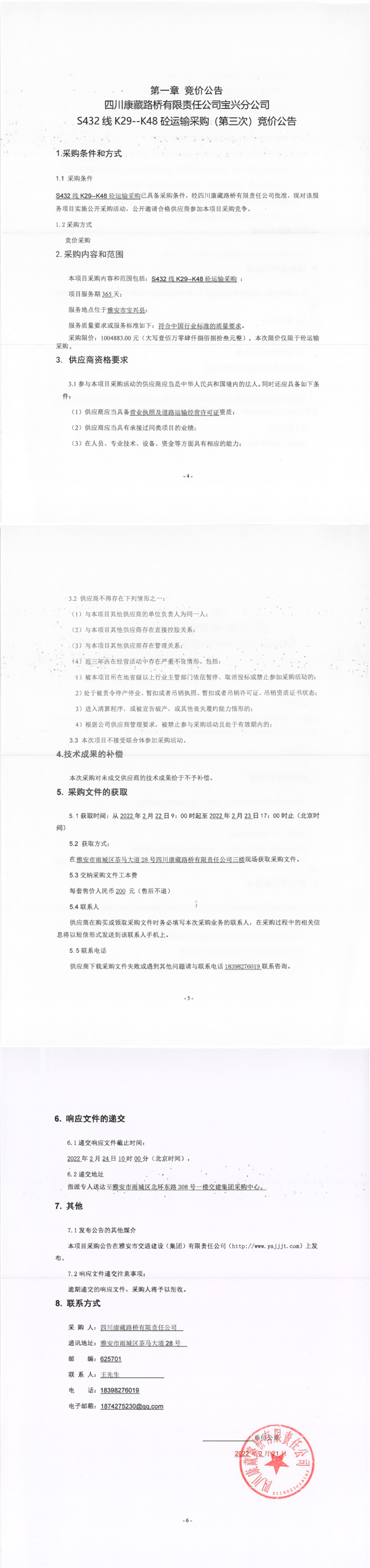 四川康藏路橋有限責(zé)任公司寶興分公司S432線(xiàn)K29-K48砼運(yùn)輸采購(gòu)(第三次)競(jìng)價(jià)公告