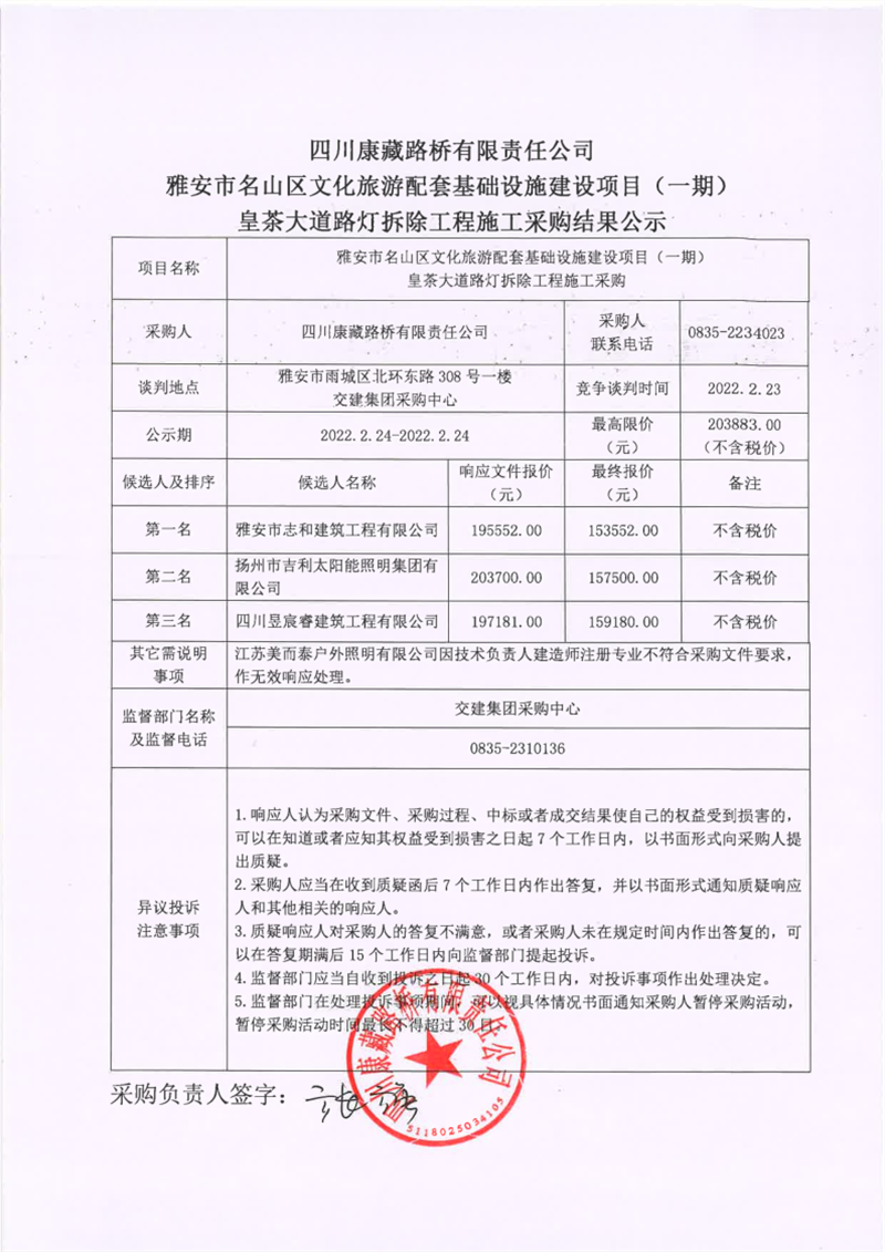 四川康藏路橋有限責任公司雅安市名山區(qū)文化旅游配套基礎設施建設項目(一期)皇茶大道路燈拆除工程施工采購結果公示