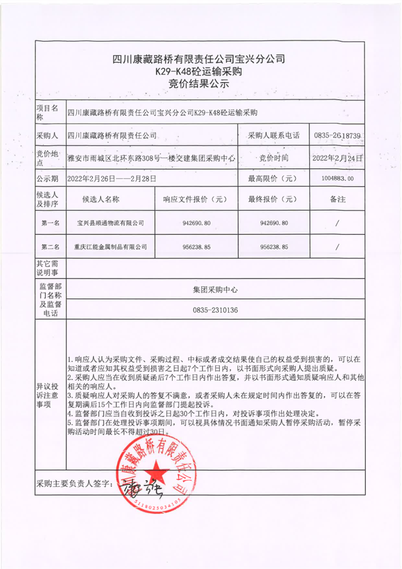 四川康藏路橋有限責(zé)任公司寶興分公司K29-K48砼運輸采購競價結(jié)果公示