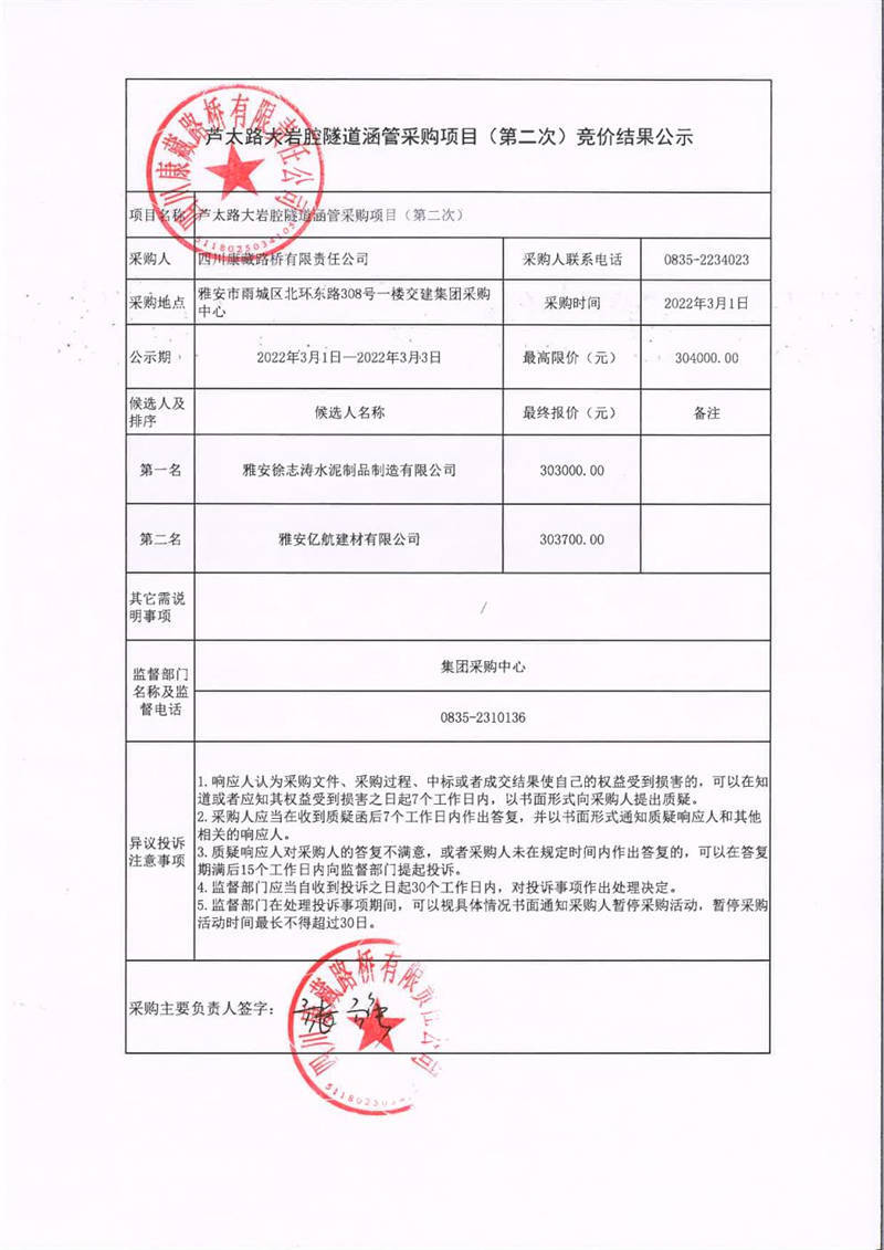 四川康藏路橋有限責(zé)任公司蘆太路大巖腔隧道涵管采購項(xiàng)目(第二次)競價(jià)結(jié)果公示